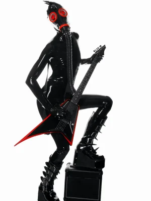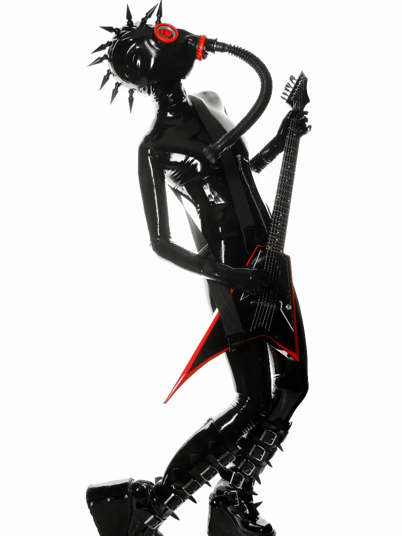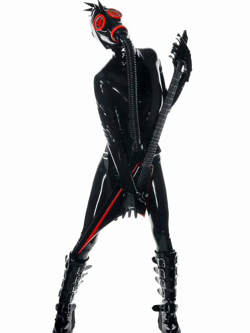 Designed with a sleek high-gloss finish, this outfit is paired with a striking gas mask featuring red accents for a dramatic look.