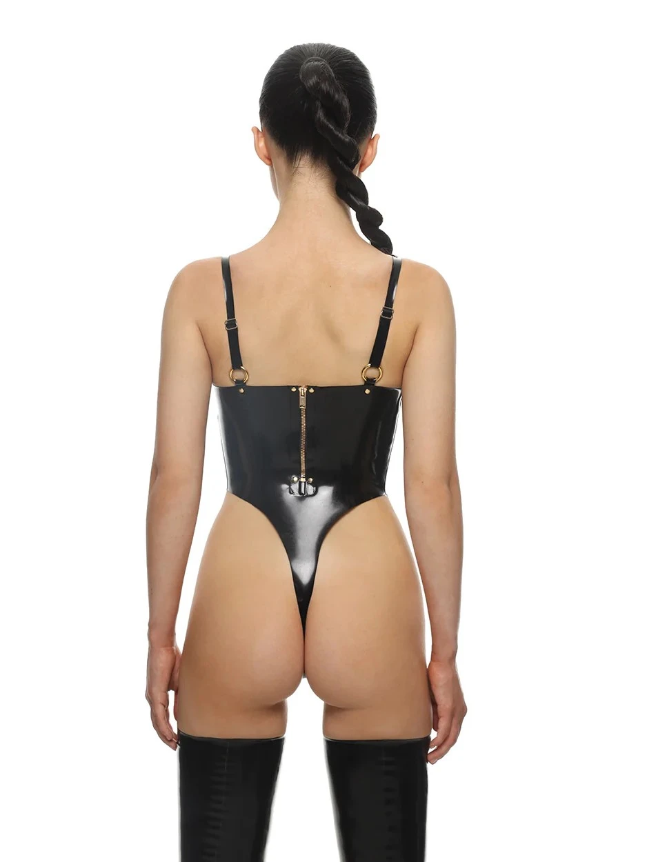 The bottom part of the bodysuit has a G-string form, and you can fasten the garment with a help of a zipper on the back.