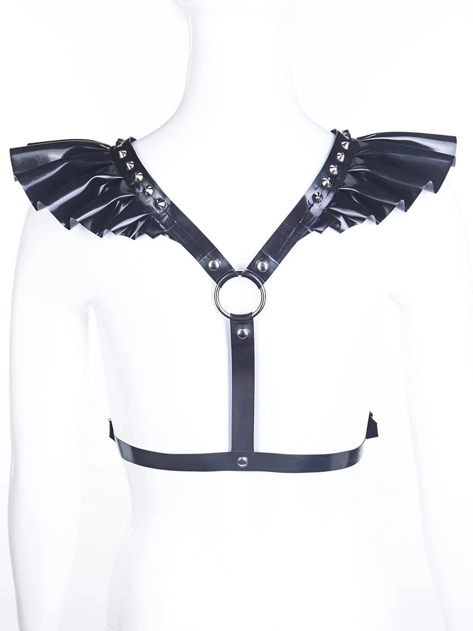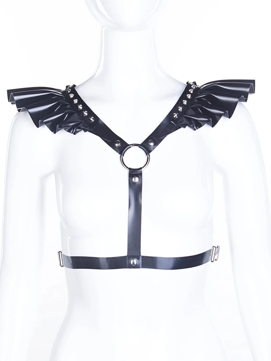 The harness features adjustable straps and ruffled and spikes details on the shoulders, adding a touch of sophistication and avant-garde style. At the center, a metal ring connects the straps, creating a striking and structured design.