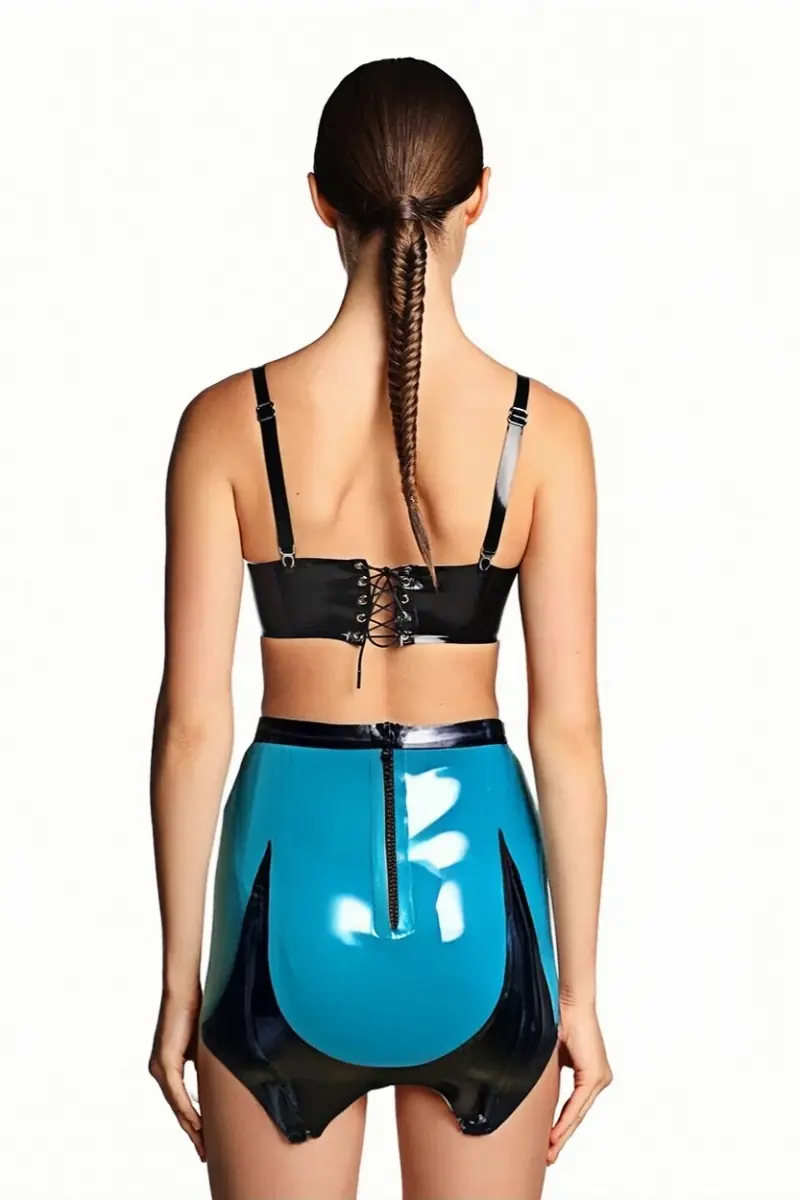 This latex garter skirt has shaped fang contrast detail on the front and back. 4 Garters and a zip back opening.