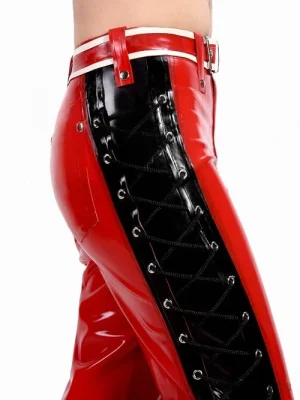 The high-waisted cut and flared silhouette work together to elongate the legs and create a retro-futuristic aesthetic. Made from glossy latex with a distinctive sheen, this piece is perfect for alternative fashion, stage performances, or bold everyday styling, making it a must-have for those seeking a standout look.