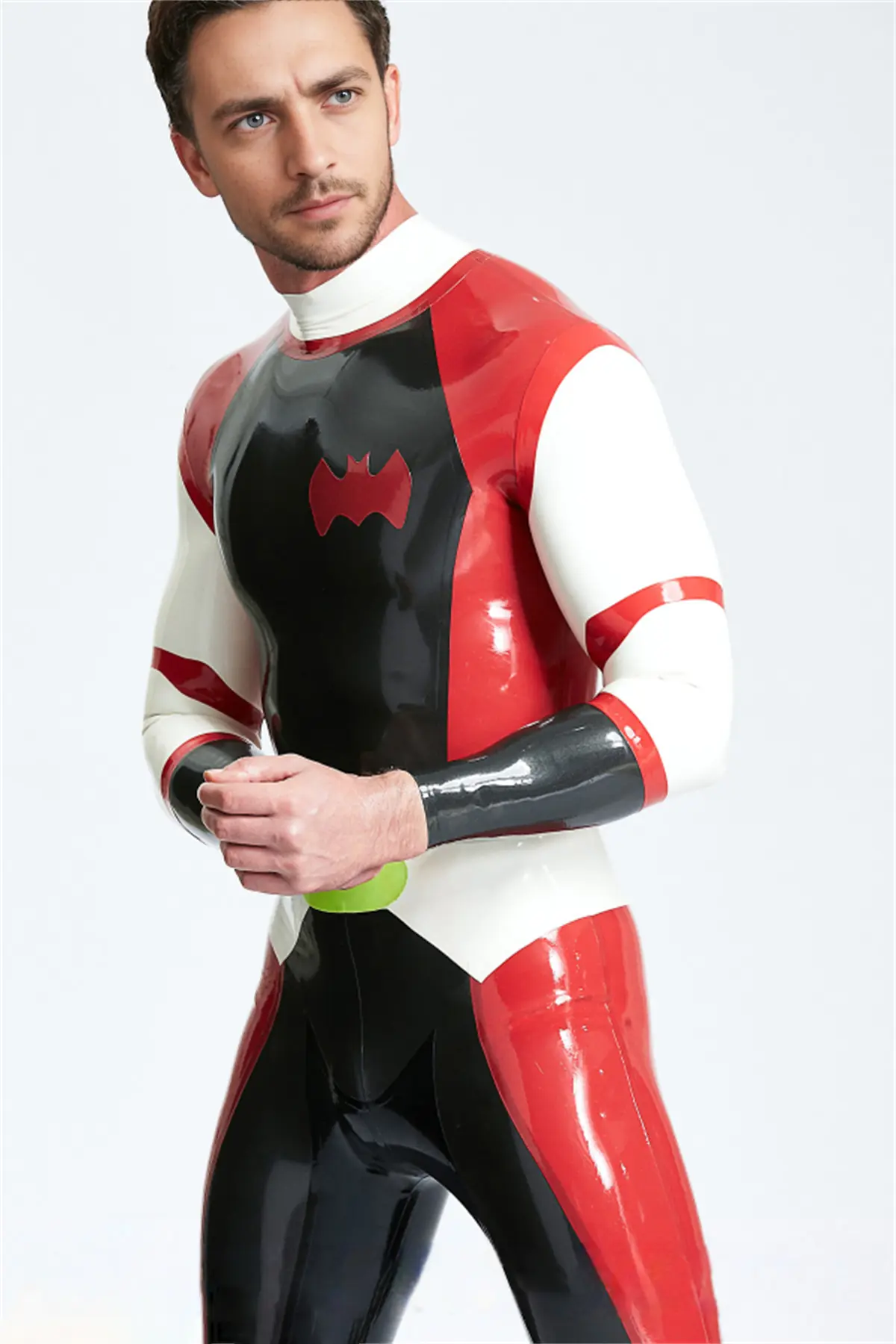 - Futuristic style catsuit with ‘batwing’ emblem on chest;