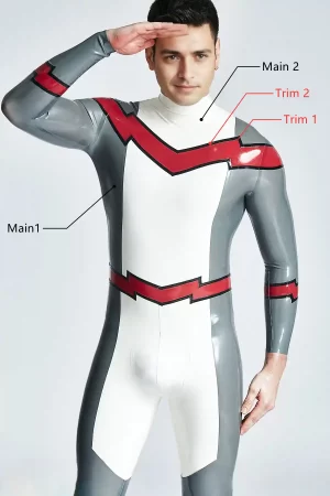 - Two-color patterned catsuit with red ‘bolt’ jagged stripes on chest, back, waist and arms;