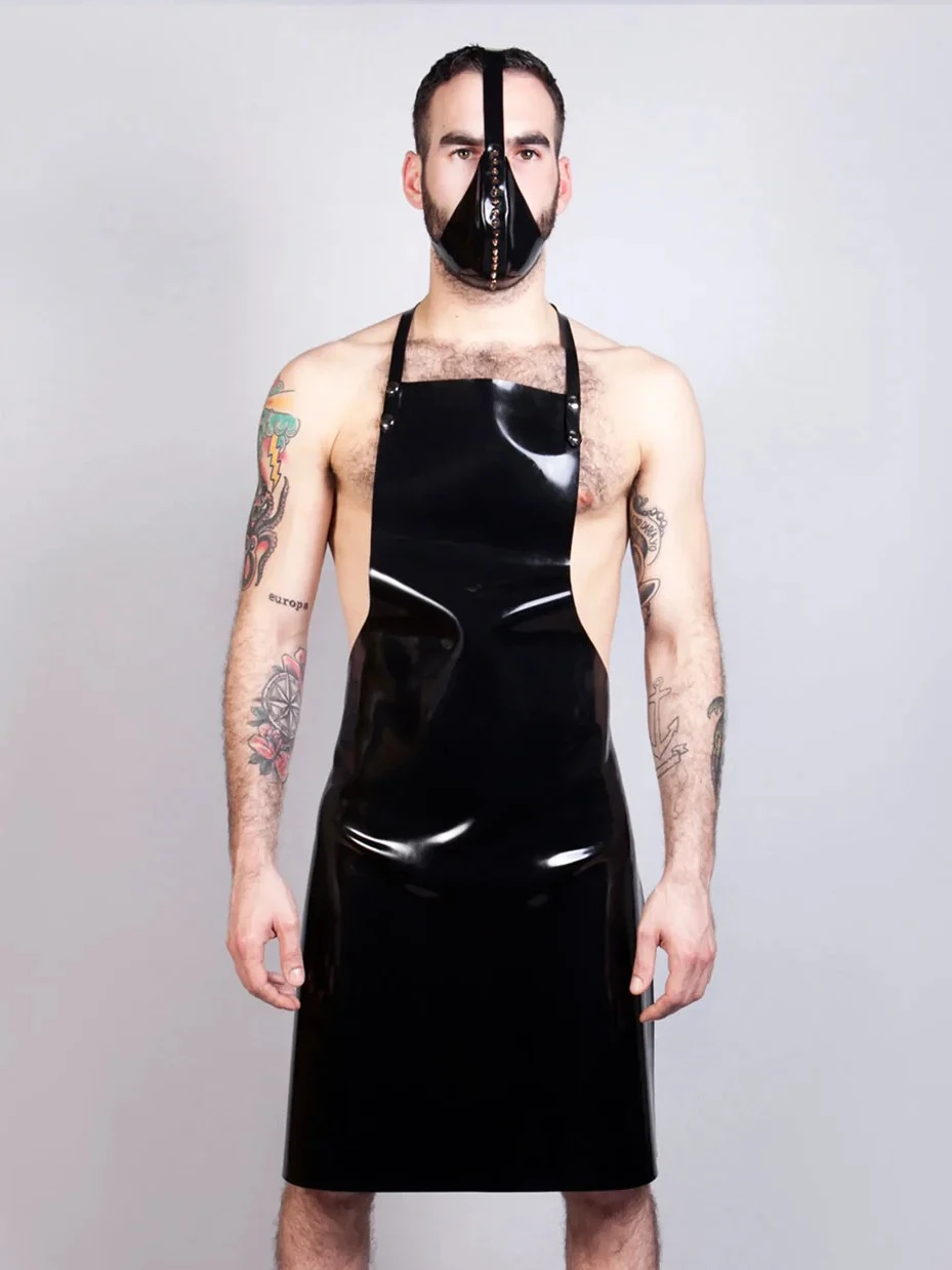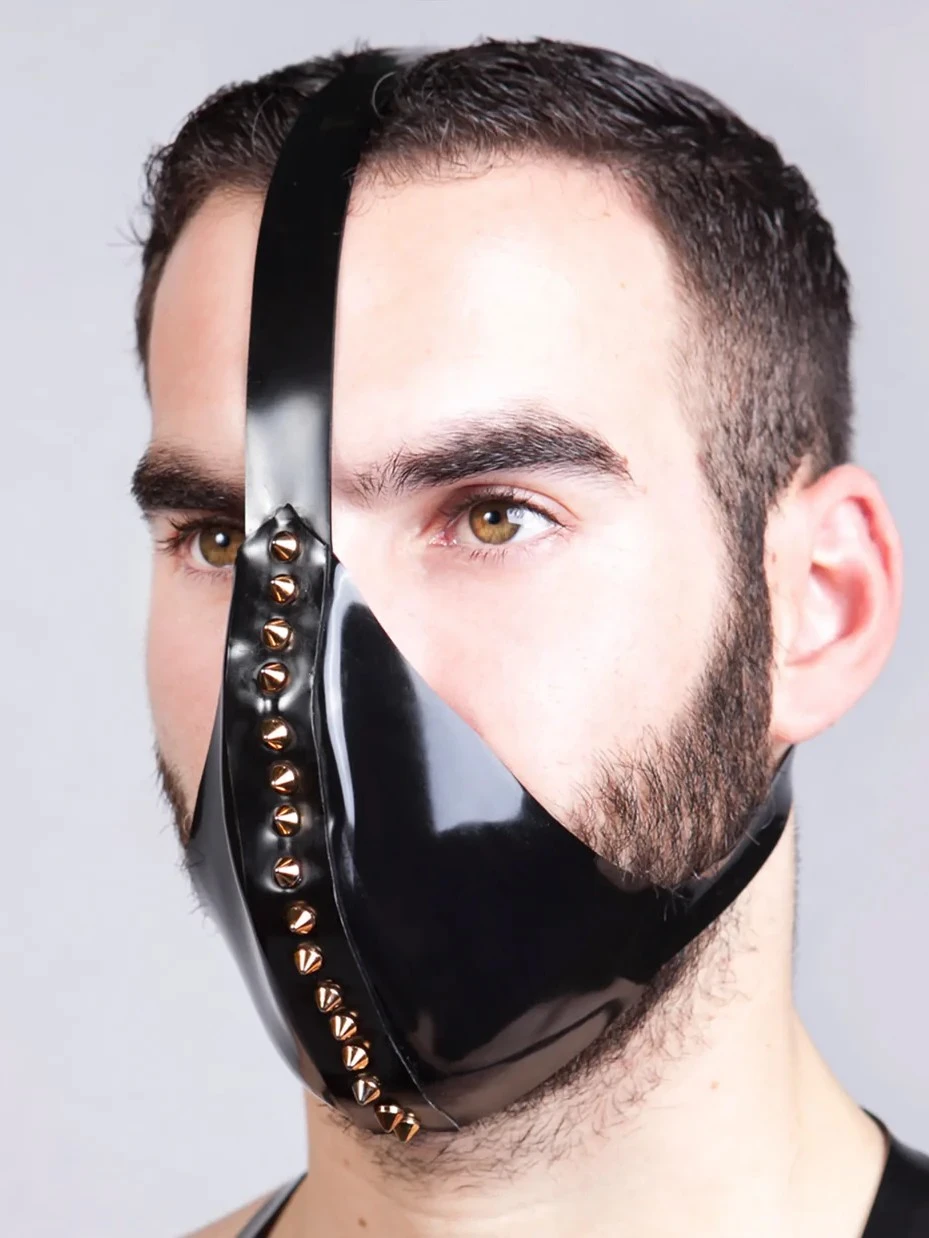 This latex face mask features adjustable buckles at the back and sides and spike appliqu?? at the front. Shown in Black with gold spikes