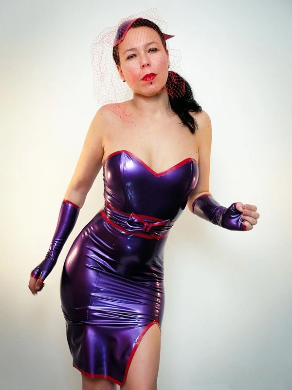 Strapless dress in latex. A slit on the left leg and a wide belt with a big bow decorate the front of the dress.