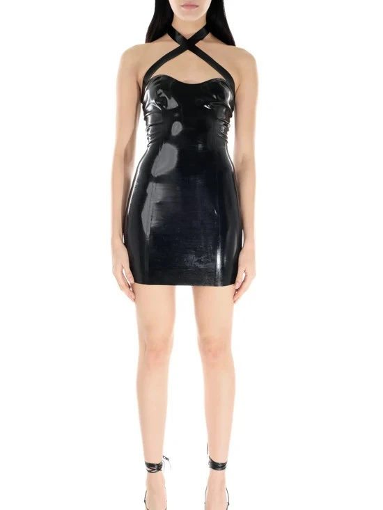 HARDWARE FASTENING AT NECK. DESIGNED WITH CRISSCROSS STRAPS. NEXT TO SKIN FIT.