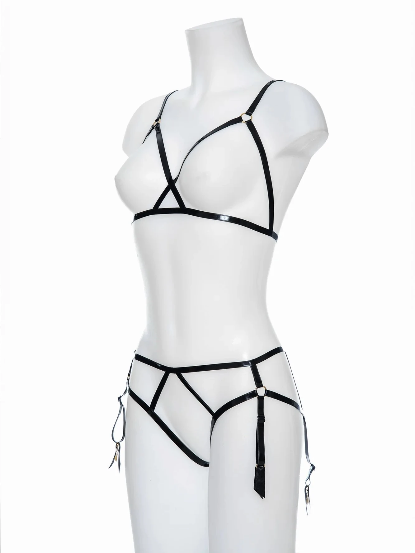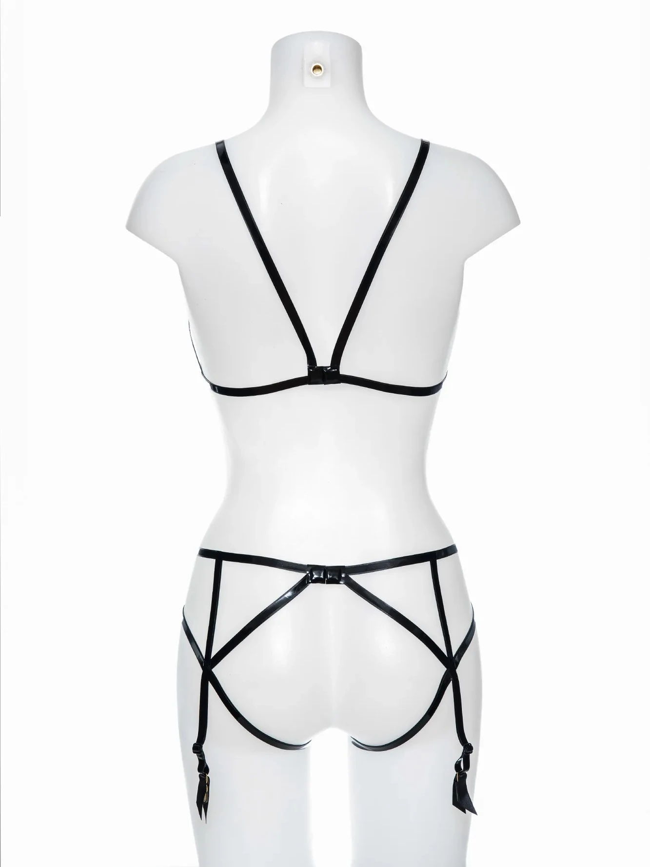 The Rain Harnesses excite with elaborate, delicate shiny straps on a matte base and beautiful, golden accents. Wear it with tight clothes to style up your look, or wear it alone on bare skin as ouvert lingerie.